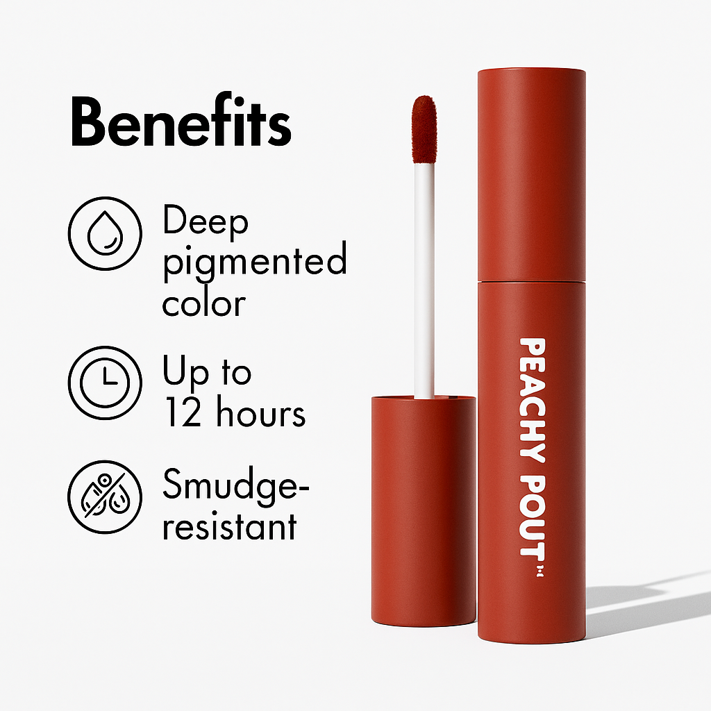 Peachy Pout™ gives you deep, juicy, all-day color that literally does not move — no smudge, no transfer, no fading weird.